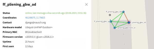 Wir können somit, wenn wir uns z.B. in einem IPv4-only Netzwerk aufhalten, ganz einfach durch den nachfolgenden Aufruf den Knoten ff_pliening_gbw_od erreichen.